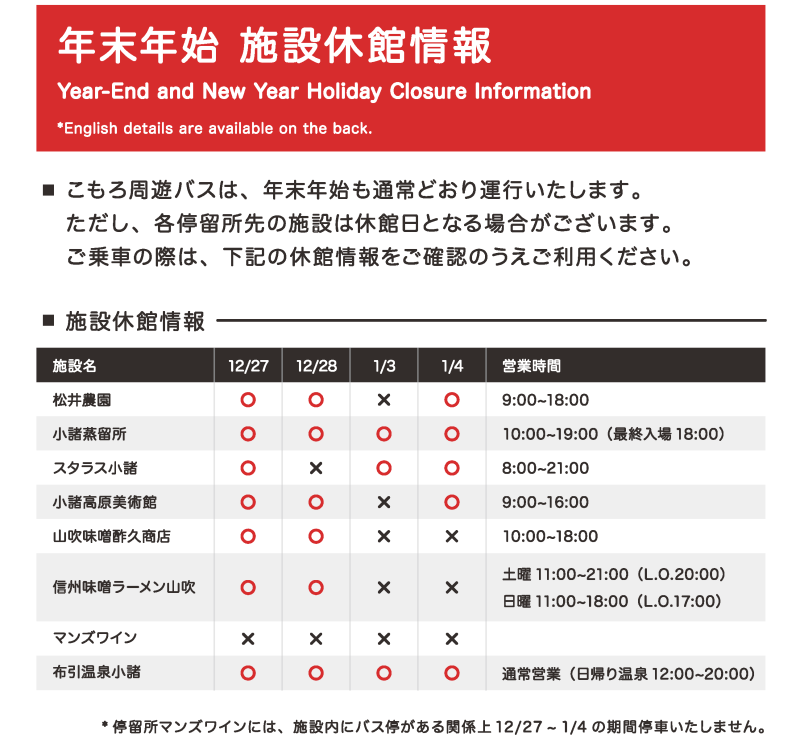 2025年11月1日より運行を開始した、乗り降り自由の「こもろ周遊バス」は、年末年始期間中も下記日程で運行いたします。