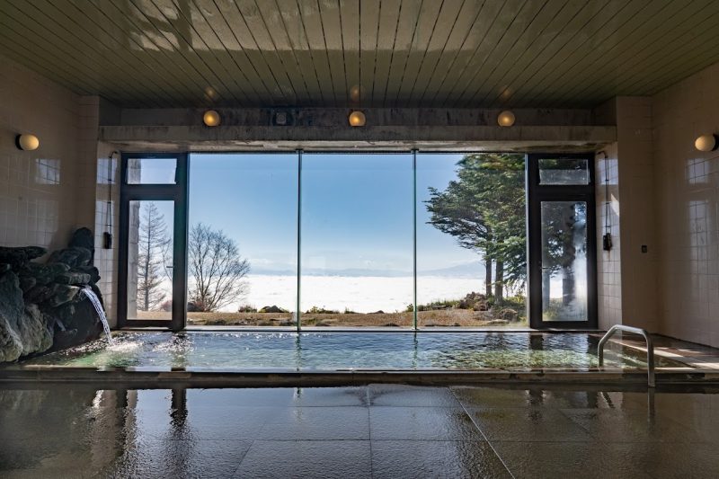 名物の「雲の上の露天風呂(インフィニティ風呂)」は、まるで空中に浮かんでいるかのような開放感が広がります。
