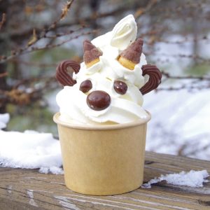 昨年冬の登場以来、大人気のカモシカソフト。カフェスタッフがひとつひとつ愛情こめてお顔のパーツを配置するので、バラエティに飛んだ表情をお楽しみいただけます。冬はカモシカとの遭遇率が高くなる季節。