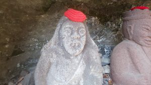 観音堂までは岩壁をくりぬいたトンネルを抜けていきます。長さ15mほどのトンネルですが、手掘りだったというから恐れ入ります。トンネルを抜けてすぐ目に入るのが、六地蔵と並ぶ閻魔大王と奪衣婆(だつえば)の石像。特に奪衣婆の表情があまりに印象的です。奪衣婆というのは、三途の川で亡者の衣服を剥ぎ取る老婆の鬼で、あの恐ろしい表情にも納得です。