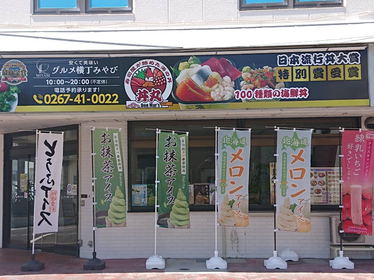 小諸の“うまい!”をひと皿で。多彩な味・個性が集う、町の新名所グルメ横丁みやび 「グルメ横丁みやび」は、小諸市荒町に2024年5月にオープンした新しい飲食スポットです。老舗寿司屋が展開する海鮮丼専門店「みやび丼丸」や、からあげ専門店「鶏笑」など、多彩なグルメが集結しています。 丼丸:海鮮丼 産地直送 新鮮70種類の海鮮丼!鶏笑:から揚げグランプリ 日本一受賞(15年連続金賞)ジェラート 浅草雷門 行列のできるジェラート 長野県小諸市荒町1-4-8 0267-41-0022 駐車場 有り 5台 営業時間 11:00〜14:00, 16:00〜19:30 定休日 火曜日 主なメニューや人気商品 鶏笑弁当 どんまる丼 前のページに戻る