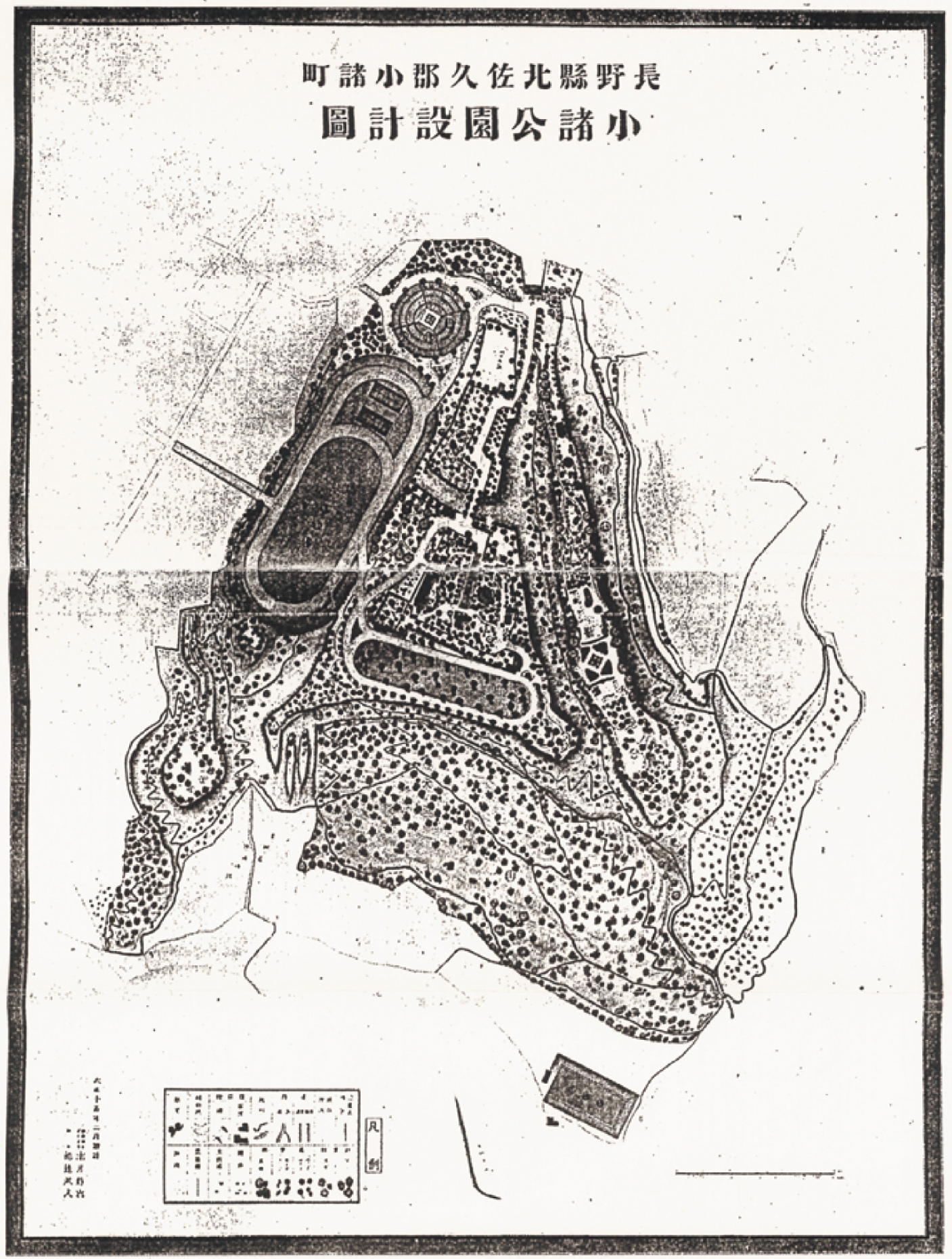 小諸公園設計案では、小諸城郭の空堀や丘陵などの地形や植生を活用し、植栽や風致林、天然植物園などを配置。さらに、児童遊園、大運動場などの設置が記載されている。