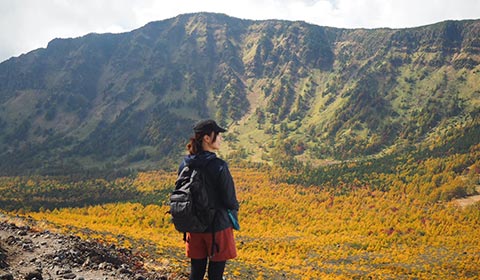 外輪山とカルデラ地形が一望できるポイント。⻑い時間をかけ作り出された火山の造形美は、時間を忘れ見とれてしまう美しさ。秋には湯の平の⻩金のカラマツ林が一望できます。