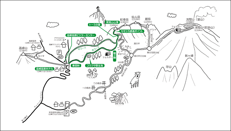 標高2,000m程に位置し、黑斑山や高峰山の登山口があります。黑斑山登山口の前に登山計画書ポストや噴火警戒レベル確認看板があり、ビジターセンターや高峰高原ホテルではヘルメットの無償貸し出しを行っています。