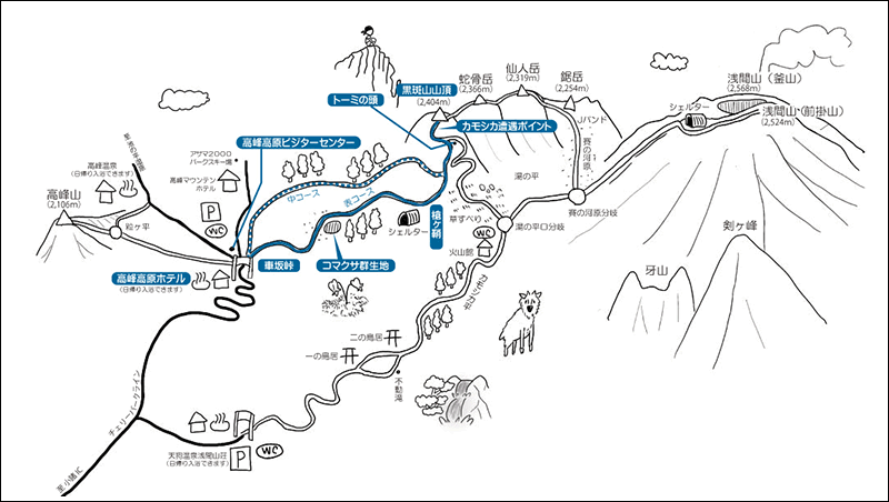 標高2,000m程に位置し、黑斑山や高峰山の登山口があります。黑斑山登山口の前に登山計画書ポストや噴火警戒レベル確認看板があり、高峰高原ホテルではヘルメットの無償貸し出しを行ってます。
